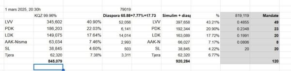 Në bazë të të dhënave aktuale mbi numërimin e votave të diasporës, Lëvizja Vetëvendosje (LVV) qëndron në rreth 65% të votave, ndërsa LDK-ja te votat me postë ka performancë më të mirë sesa në votat e hedhura në Kosovë.