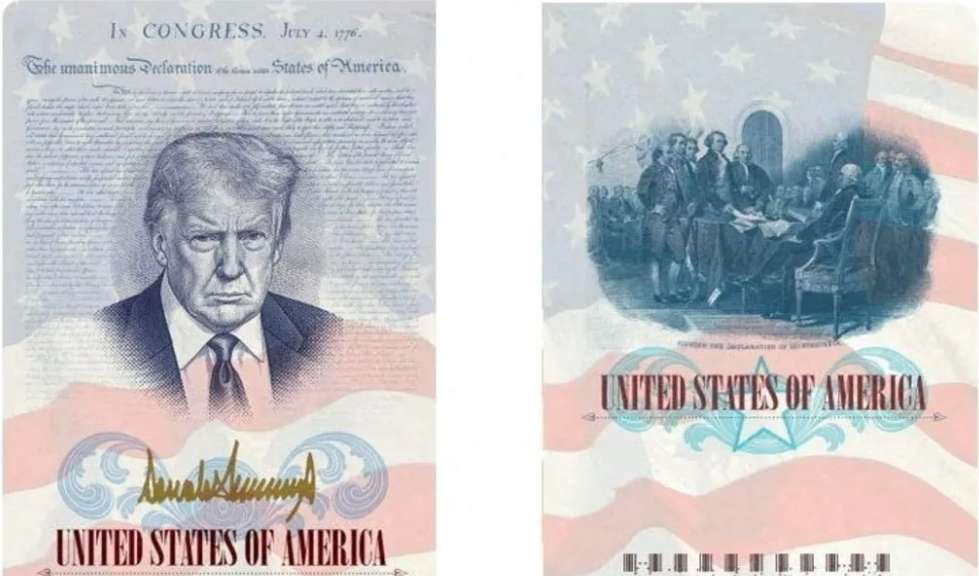 Në një paraqitje të pasaportës të lëshuar nga Departamenti i Shtetit i SHBA-së, një imazh i Trump shihet i rrethuar nga teksti i Deklaratës së Pavarësisë dhe flamuri amerikan, së bashku me firmën e presidentit me ngjyrë ari.