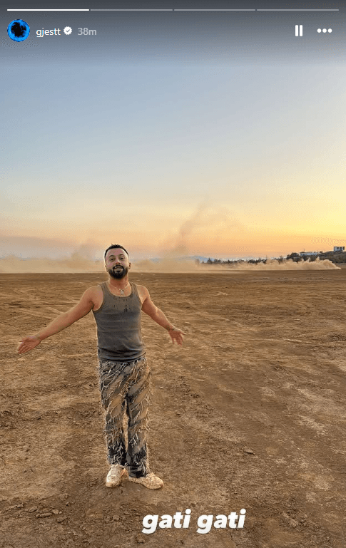 Në një nga videot që tashmë po qarkullon në rrjet, Gjesti shfaqet duke pirë ujë në prapaskenë, i lodhur pas një skene ku makina krijoi shumë pluhur, duke e bërë momentin jo pak sfidues.