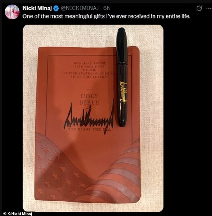 Reperja 43-vjeçare ndau imazhin në llogarinë e saj X, ku shihej Bibla me mbishkrimin “God Bless The USA” dhe firmën e ish-presidentit në mes të kopertinës.