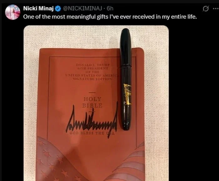 Reperja 43-vjeçare ndau imazhin në llogarinë e saj X, ku shihej Bibla me mbishkrimin “God Bless The USA” dhe firmën e ish-presidentit në mes të kopertinës.