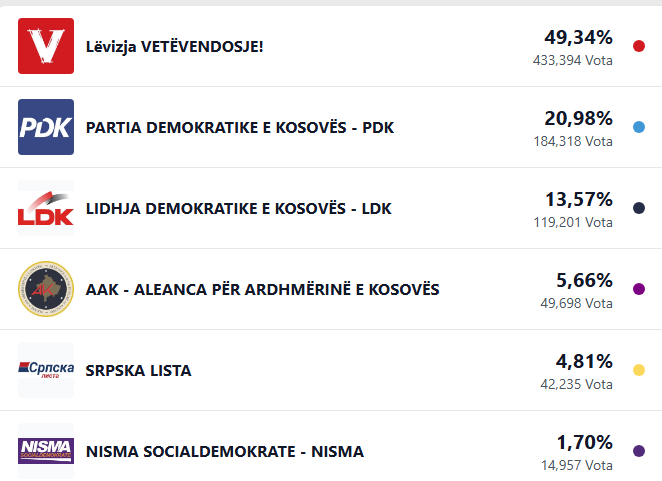 Në zgjedhjet e 28 dhjetorit, Lëvizja Vetëvendosje ka dalë parti e parë me një diferencë dukshëm të madhe nga partia e dytë dhe e tretë. Partia që drejton Kurti pritet të marrë 56 deputetë në Kuvendin e Kosovës, gjë që pritet t’ia mundësojë krijimin e qeverisë së re vetëm me pakicat joserbe.