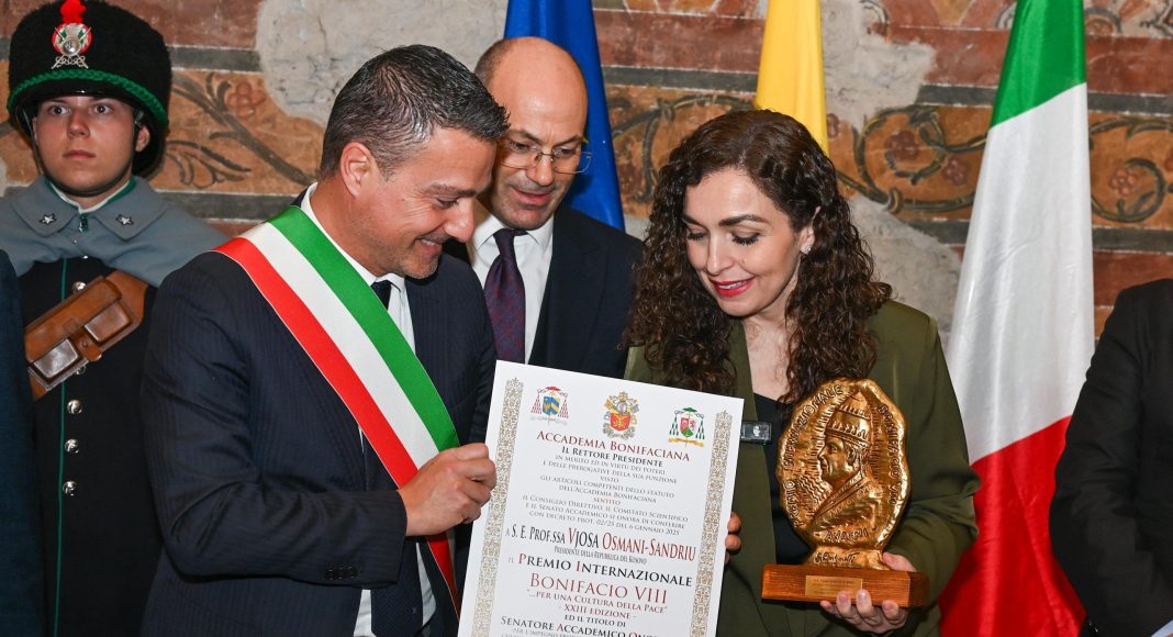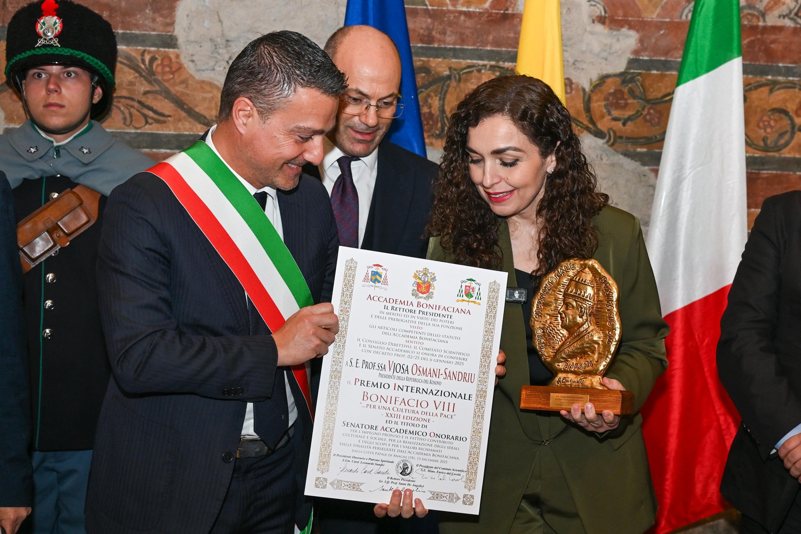Presidentja e Republikës së Kosovës, Vjosa Osmani, u nderua mbrëmë në Anagni, qytetin e Papëve, me Çmimin Bonifacio VIII, i ndarë nga Akademia Bonifaciana, në vlerësim të angazhimit të saj institucional për paqen, si dhe kontributit të vazhdueshëm në forcimin e bashkëpunimit ndërkulturor dhe ndërfetar.