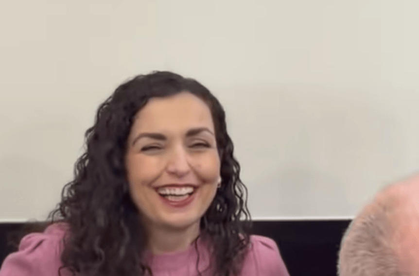 Përgjatë kësaj vizite, ajo qëndron në një çajtore në Podujevë, ku pyet njërin nga qytetarët se kujt ia ka dhënë xhygymat.