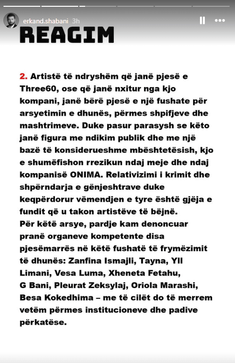 Ai përmend emra të njohur të artistëve, duke përfshirë Zanfina Ismailin, Taynën, Yll Limanin, Vesa Lumën, Xheneta Fetahun, G Banin, Pleurat Zeksyla-n, Oriola Marashin dhe Besa Kokëdhimën, duke nënvizuar se çdo çështje do të trajtohet përmes institucioneve ligjore.