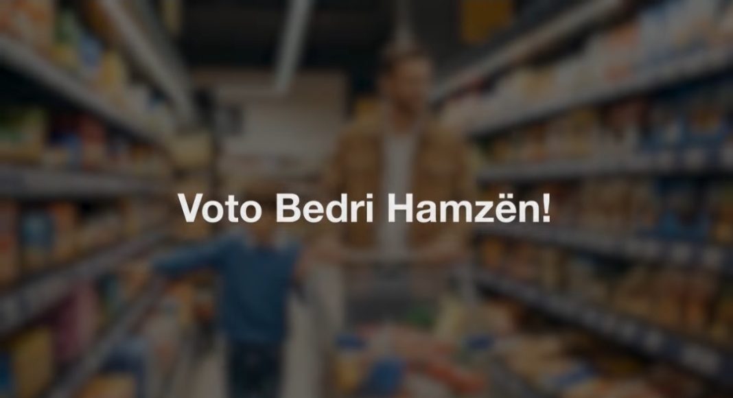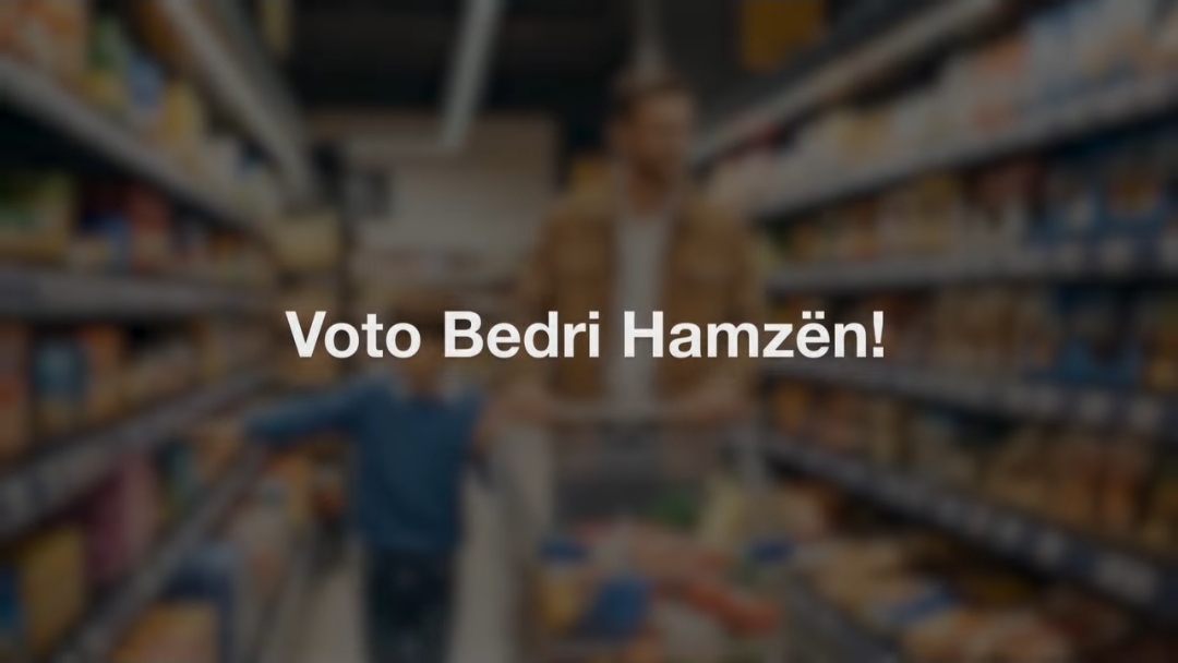 Në video shfaqet një burrë me fëmijën e tij, i shoqëruar me mbishkrimin: “Çmime më të ulëta, shporta plot. Voto Bedri Hamzën.”