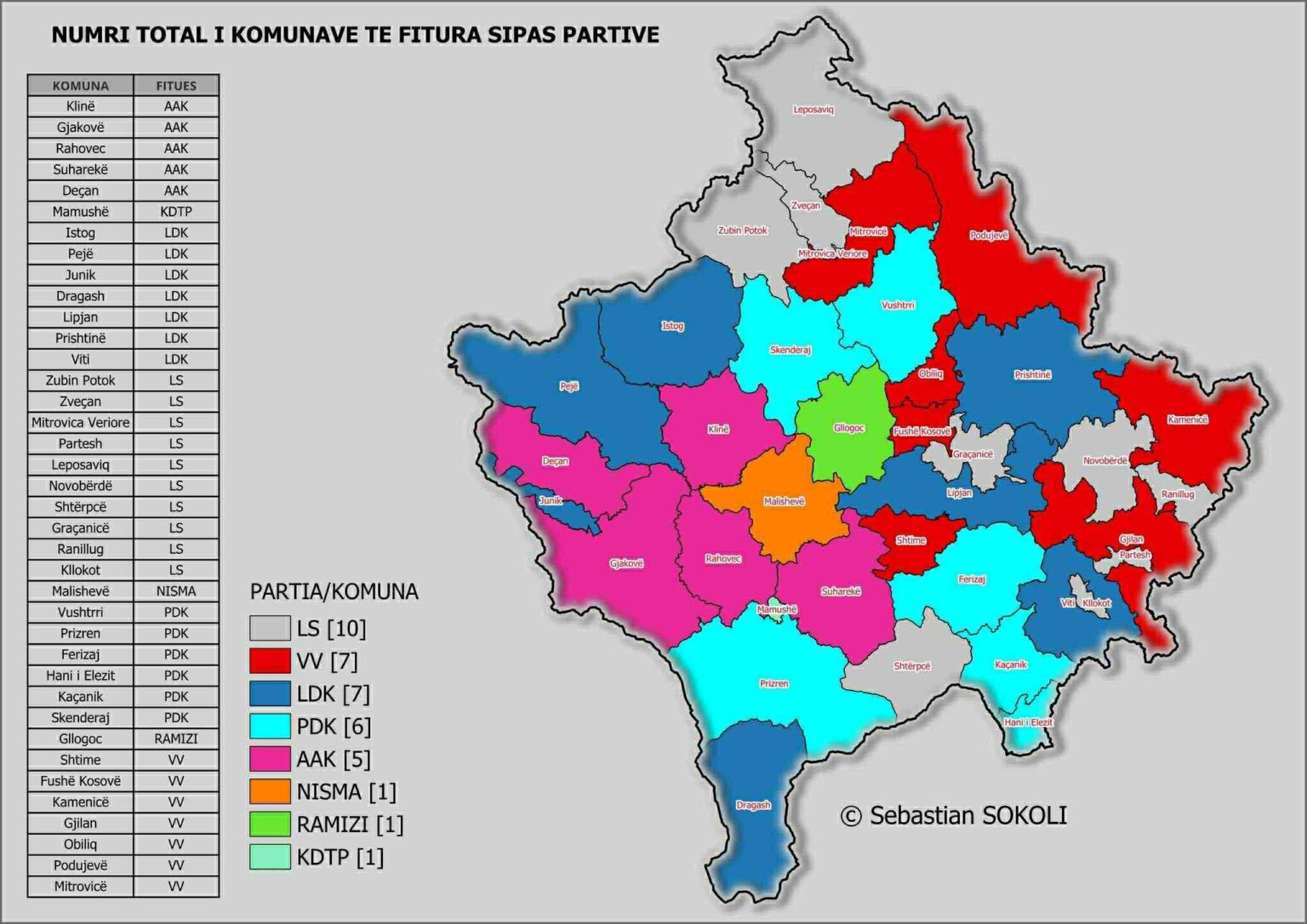 Gjashtë komuna nën udhëheqjen e saj do t’i ketë Partia Demokratike e Kosovës: Vushtrria, Prizreni, Ferizaj, Hani i Elezit, Kaçaniku dhe Skenderaj.