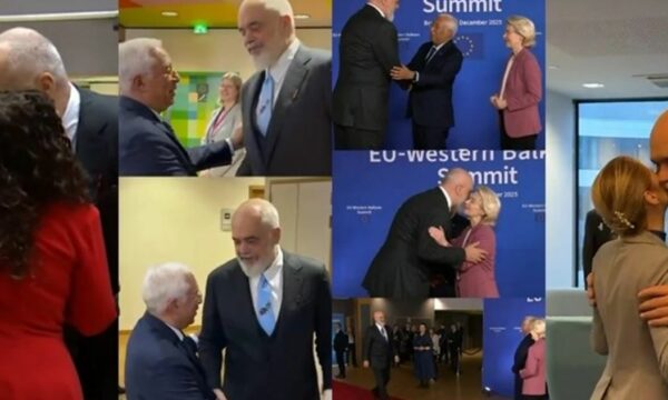 Në pamjet e publikuara, kreu i qeverisë shqiptare shihet krah liderëve europianë dhe atyre të rajonit, përfshirë Antonio Costa, Kaja Kallas, Ursula von der Leyen dhe Marta Kos, teksa shkëmben shtrëngime duarsh dhe përqafime me ta.