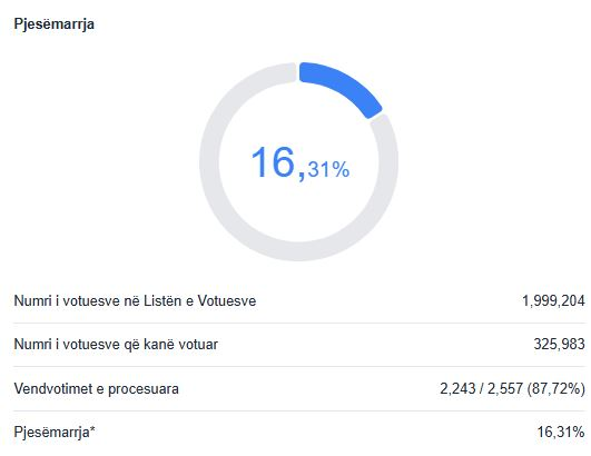 Sipas përditësimit të fundit të të dhënave në faqen e Komsionit Qendror të Zgjedhjeve , në përqindje i bie se kanë dalë në votime 16.31.