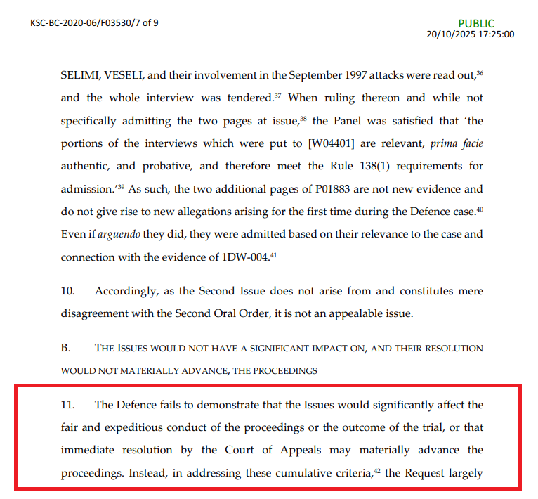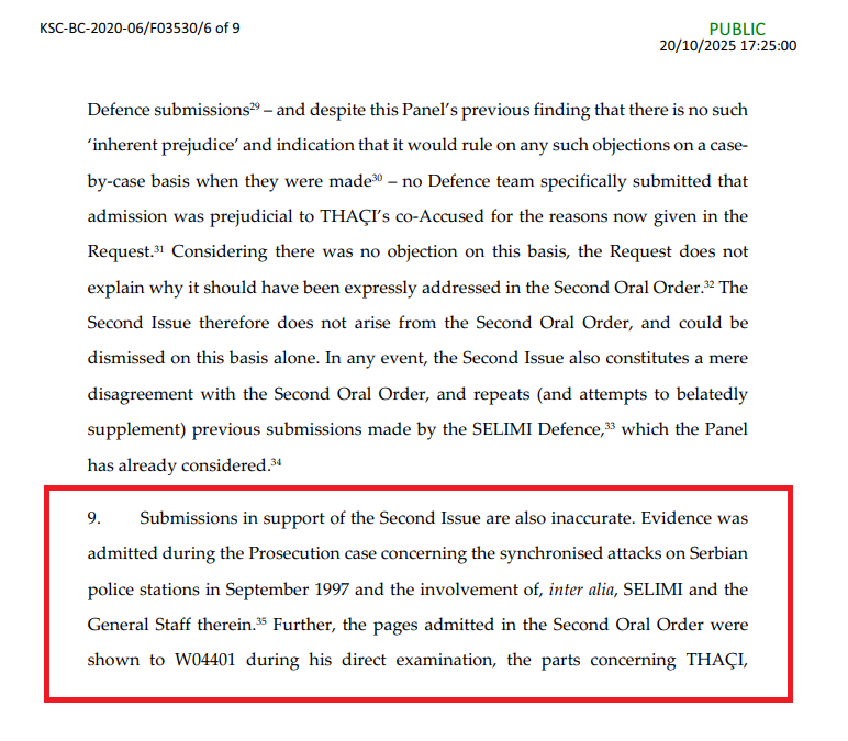 “Për më tepër, faqet që ishin pranuar nëpërmjet Urdhrit të Dytë Gojor iu treguan dëshmitarit W04401 gjatë ekzaminimit të tij të drejtpërdrejtë. Pjesët që kishin të bënin me Thaçin, Selimin dhe Veselin, si dhe me përfshirjen e tyre në sulmet e shtatorit 1997, u lexuan me zë gjatë seancës, ndërsa i tërë intervistimi u paraqit si provë. Kur trupi gjykues mori vendim mbi këtë çështje, edhe pse nuk i pranoi në mënyrë specifike dy faqet në fjalë, ai u shpreh i bindur se ‘pjesët e intervistave që iu parashtruan dëshmitarit [W04401] janë të rëndësishme, në dukje autentike dhe me vlerë provuese, dhe për rrjedhojë i plotësojnë kërkesat e Rregullës 138(1) për pranueshmëri’”, thuhet në parashtresën e organit të akuzës.