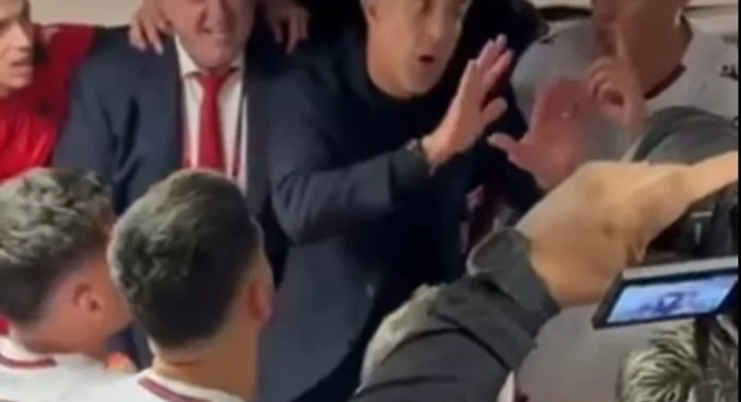 Në një video të publikuar nga “Top-Channel”, dëgjohet edhe tekniku brazilian “Do t’iu lë vetëm, por…”, mirëpo lojtarët shqiptarë nuk e lejuan pasi s’i ndalën festimet.