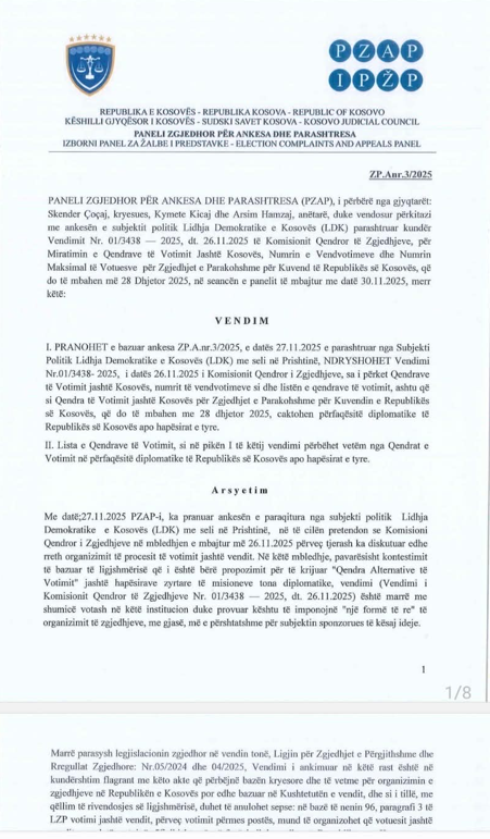 Paneli Zgjedhor për Ankesa dhe Parashtresa (PZAP) ka refuzuar mundësinë që votimi të zhvillohet jashtë përfaqësive diplomatike, duke e rrëzuar kështu vendimin e mëparshëm të KQZ-së për zgjedhjet e 28 dhjetorit.