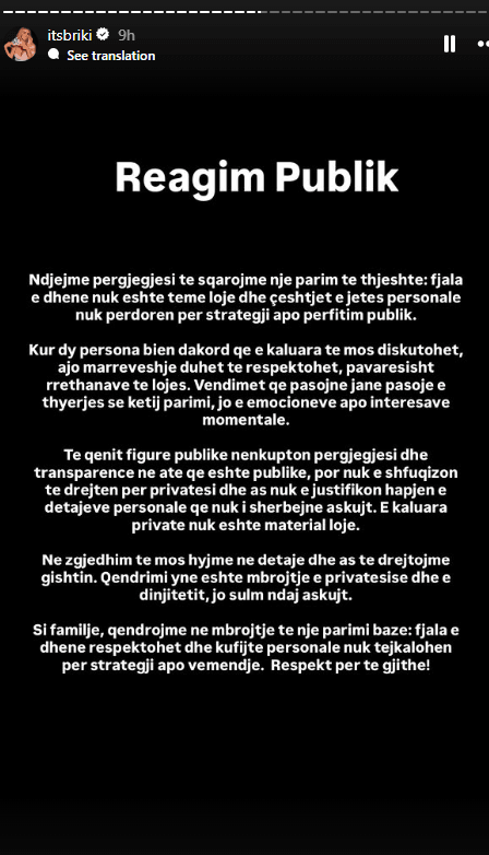 Në lidhje me këtë u bë një reagim edhe nga Instagrami i Brikenës, i cili siç shihet menaxhohet nga familja.