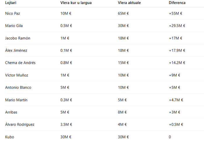 Lojtarë të tjerë si Víctor Muñoz (Osasuna), ‘El Toro’ (Elche), Mario Gila, Álex Jiménez, Antonio Blanco dhe Arribas gjithashtu kanë parë rritje të konsiderueshme të vlerës së tyre treguore.