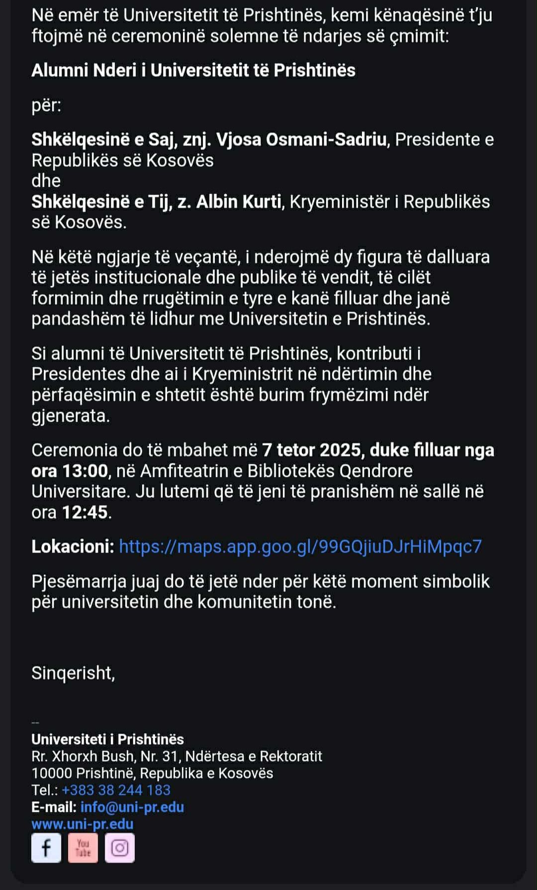 Çmimi që do t’u ndahet Kurtit e Osmanit quhet ‘Alumni Nderi i Universitetit të Prishtinës’, kinse për frymëzim të gjeneratave nga ndërtimi dhe përfaqësimi i shtetit.
