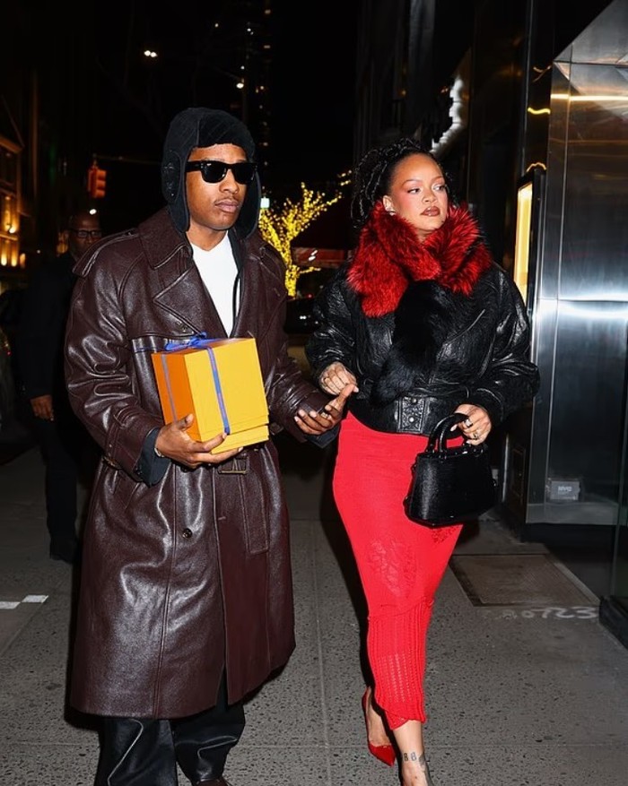 Këngëtarja 37-vjeçare mbante një fustan të gjatë të kuq, taka gjigante të kuqe dhe një xhaketë të zezë prej lëkure, ndërsa unaza e saj e floririt në gishti të katërt i shtoi spekulimet për martesën e fshehtë me ASAP Rocky, shkruan DailyMail.