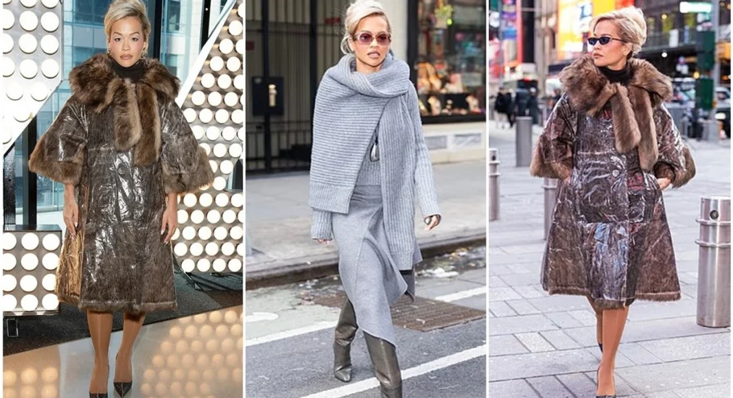 Para ditës së madhe të së mërkures, Rita u pa me një veshje elegante gri, përpara se të shfaqej me një veshje tjetër teksa mori pjesë në konferencën për shtyp me bashkëprezantuesin e saj pranë Times Square Ball.
