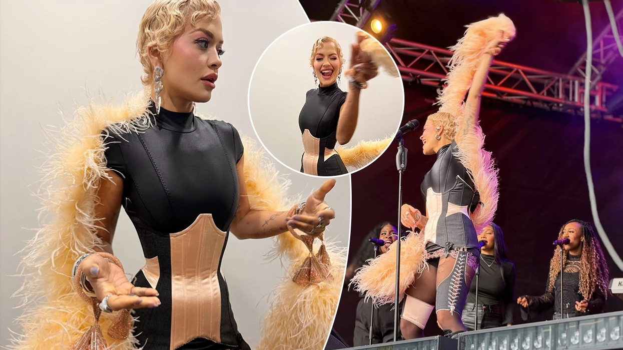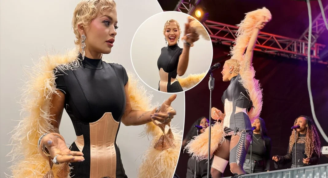 Rita Ora u sigurua të tërhiqte gjithë vëmendjen teksa tregoi belin e saj shumë të hollë me një minifustan korsé prej lëkure të zezë gjatë performancës së saj në Irlandë.