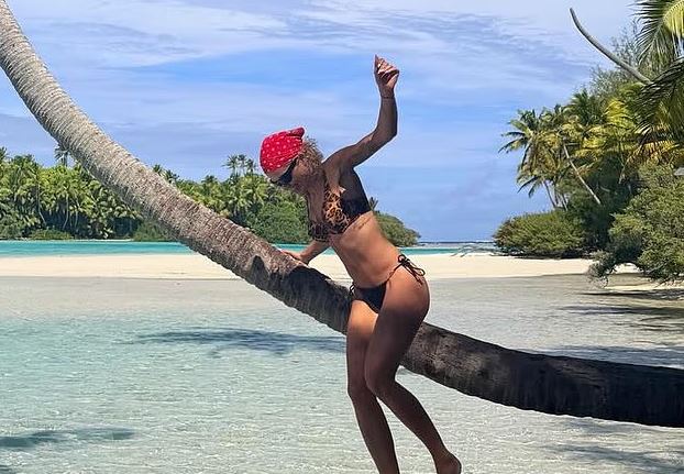 Këngëtarja 35-vjeçare dukej sensacionale me këtë kostum të guximshëm me dy pjesë, ndërsa shtrihej mbi një palmë të rrëzuar përpara se të hidhej në oqeanin piktoresk.