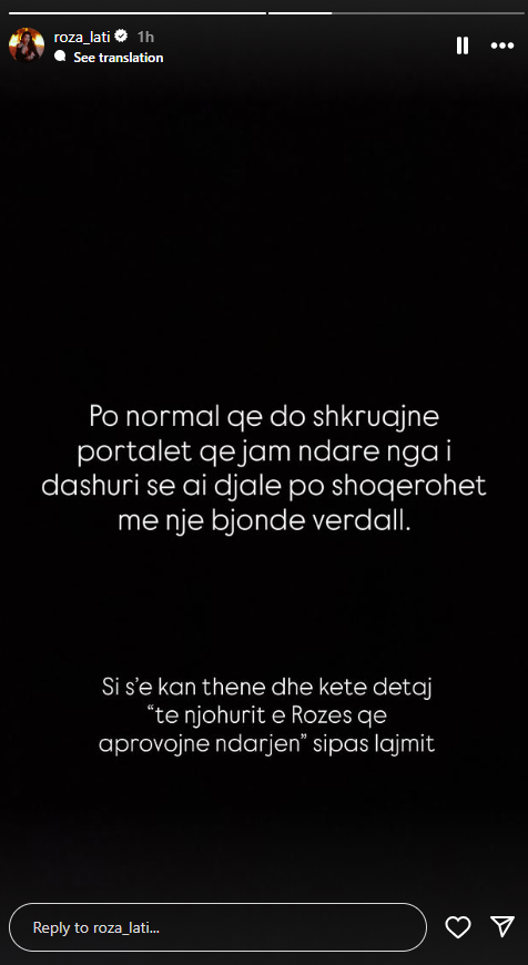 Përmes një postimi ironik në rrjete sociale, Roza u shpreh: “Po normal që do shkruajnë portalet që jam ndarë nga i dashuri, se ai djalë po shoqërohet me një bionde vërdallë”.