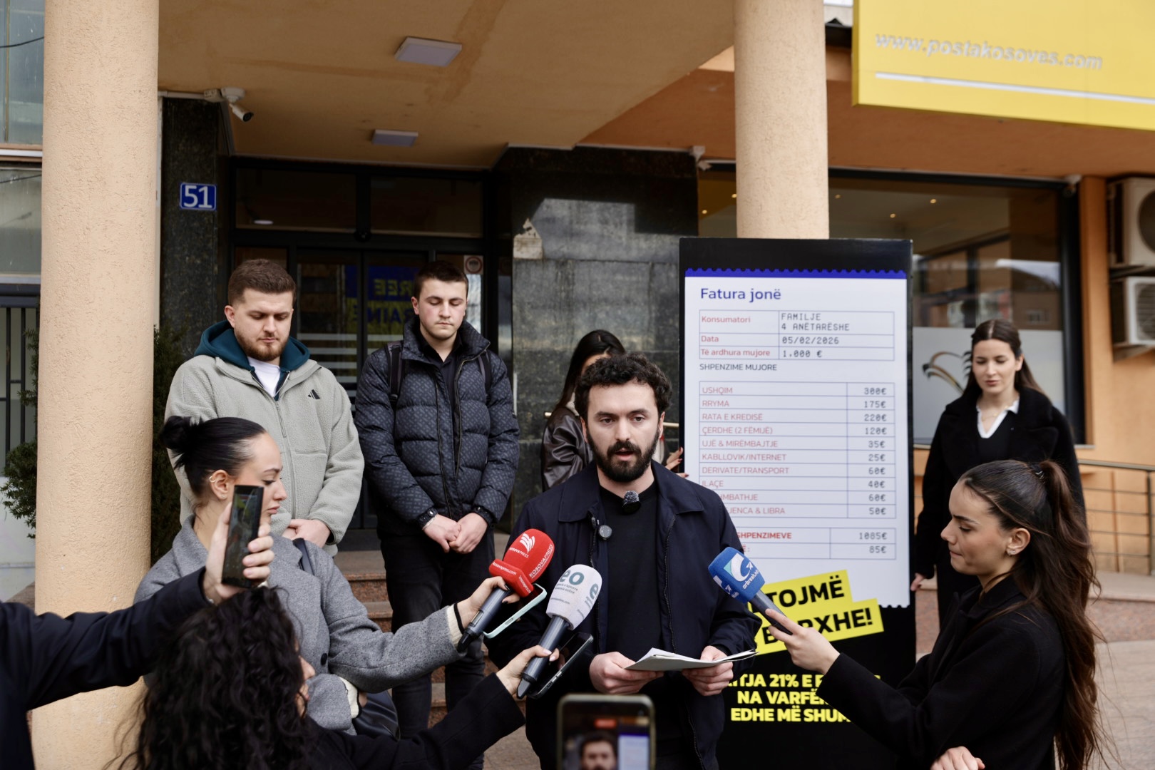 “Sot s’kemi ardhë me pankarta. Kemi ardhë me një faturë. Një faturë që po e ngulfatë jetën e qytetarëve çdo muaj. Një familje në Kosovë, me 1000 euro të ardhura mujore, ka 1085 euro shpenzime bazike. Pa luks. Pa pushime. Pa kursime. Vetëm bukë. Vetëm rrymë. Vetëm ngrohje. Vetëm qira, ilaçe dhe shkollë për fëmijët. Minus 85 euro çdo muaj. Çdo muaj fillon me borxhe. Çdo muaj mbyllet me frikë”, tha Syla.