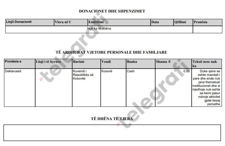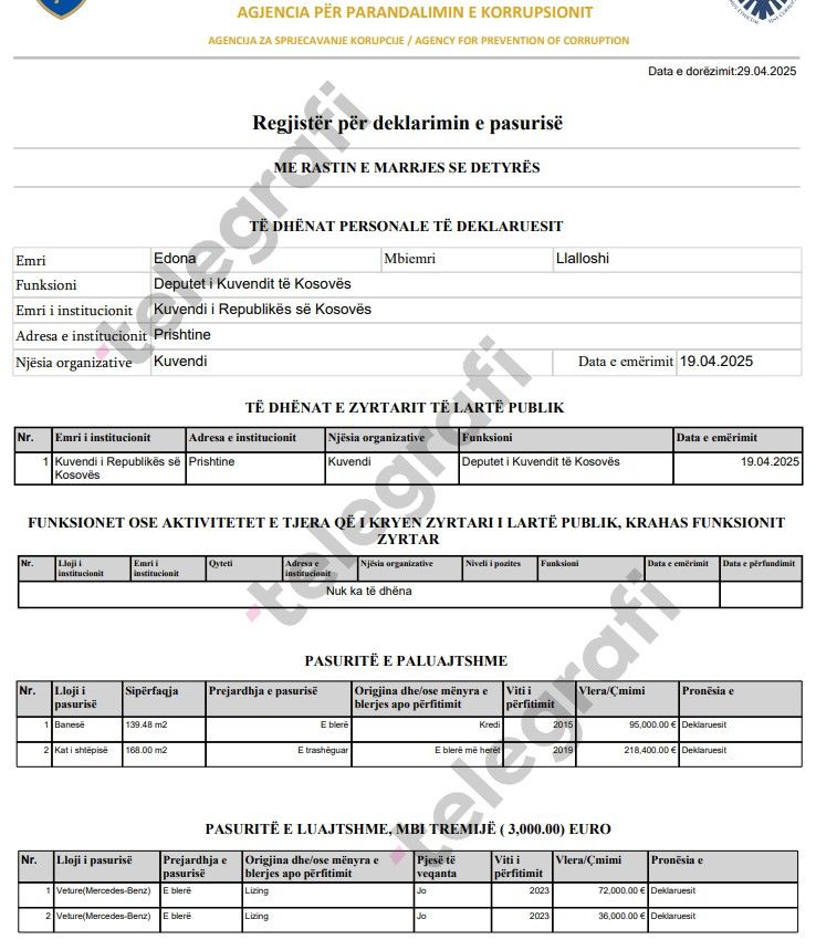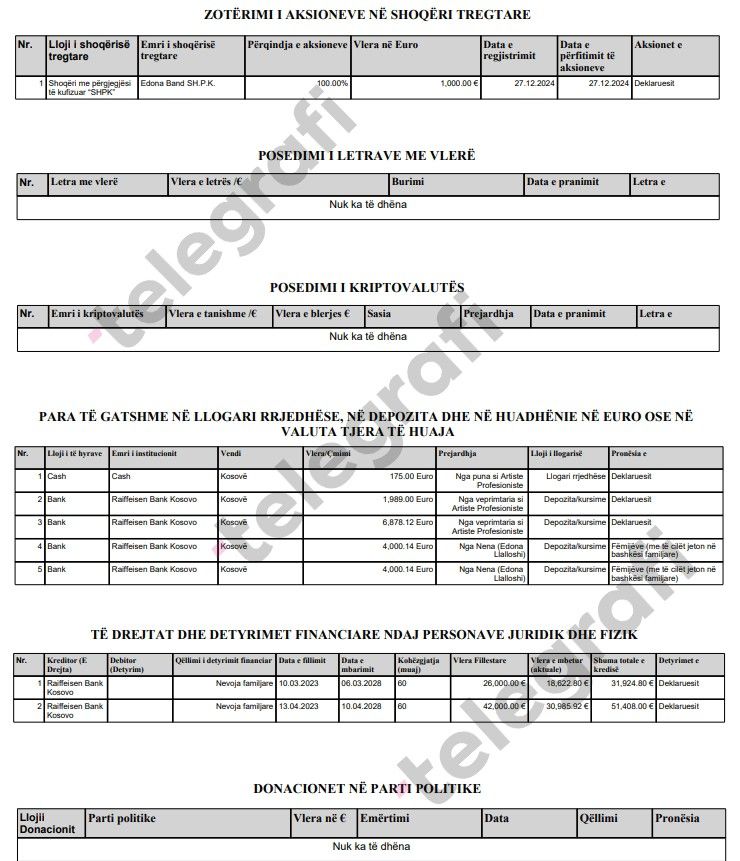 Ky është një prej deklarimeve më të detajuara të ndonjë artisti që është pjesë e jetës politike në Kosovë, duke hedhur dritë mbi mënyrën se si figura publike menaxhojnë pasurinë e tyre në përputhje me detyrimet ligjore dhe transparencën publike. /Telegrafi/