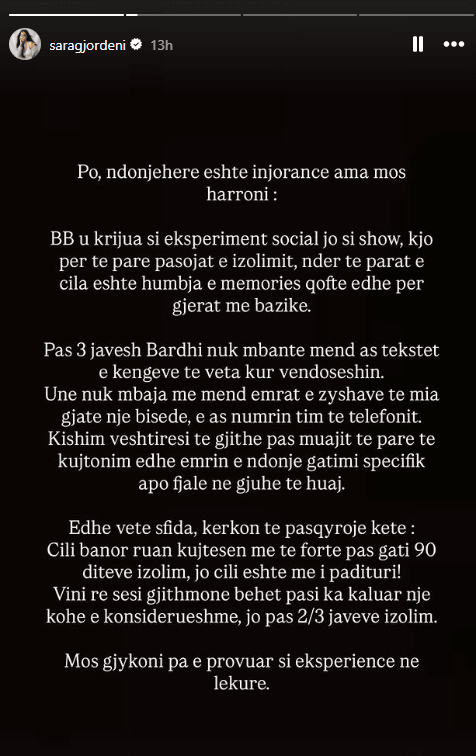 “Po, ndonjëherë është injorancë ama mos harroni: Big Brother u krijua si eksperiment social jo si show, kjo për të parë pasojat e izolimit, ndër të parat e cila është humbja e memories qoftë edhe për gjërat më bazike.