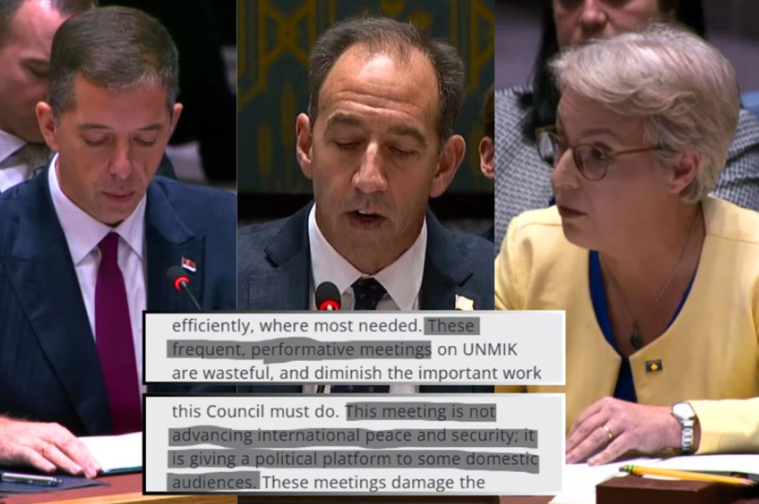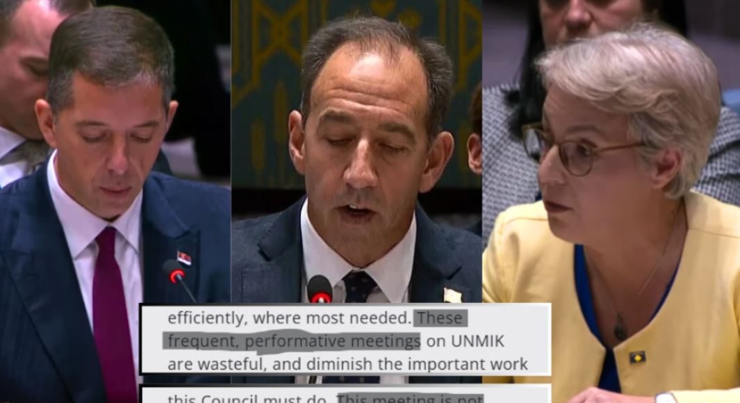 - “Kolegë, nëse jemi të përkushtuar fort ndaj kauzës së paqes, duhet të sigurohemi gjithashtu që koha dhe burimet e Këshillit të shpenzohen në mënyrë efikase, aty ku është më e nevojshme. Këto takime të shpeshta dhe për shfaqje mbi UNMIK-un janë të kota dhe e zvogëlojnë punën e rëndësishme që duhet të bëjë ky Këshill. Ky takim nuk po përparon paqen dhe sigurinë ndërkombëtare; po u jep një platformë politike disa audiencave vendase. Këto takime dëmtojnë institucionin”, tha ambasadori amerikan në KS të OKB-së, Jeff Bartos.