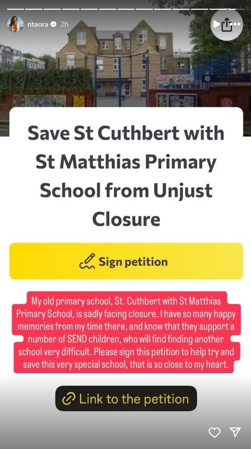 Në një postim të fundit në InstaStory, ajo ka ndarë një thirrje publike për të nënshkruar një peticion në mbështetje të Shkollës Fillore “St Cuthbert with St Matthias”, e cila sipas saj po përballet me mbyllje të padrejtë.