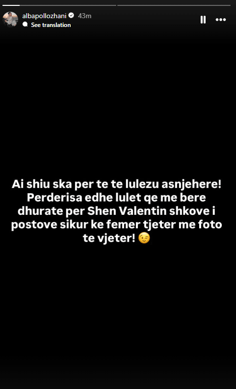 “Ai shiu s’ka për të të lulëzuar asnjëherë. Përderisa edhe lulet që më bëre dhuratë për Shën Valentin shkove i postove sikur ke femër tjetër me fotografi të vjetër”, ka shkruar ajo në një postim në InstaStory.