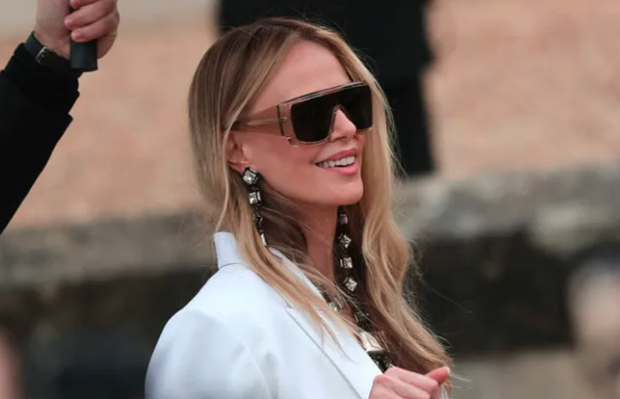 Në sfilatën pranverë/verë 2026 të Dior, Theron u shfaq në rreshtin e parë me një pamje që tërhoqi vëmendjen menjëherë: pa bluzë, e veshur me geta të zeza transparente, pantallona të shkurtra të gjera, një xhaketë lëkure të errët në stil motorçiklisti dhe këpucë bardh e zi të sheshta. Aksesori që i dha pamjes një kontrast të veçantë ishte një çantë e kuqe.