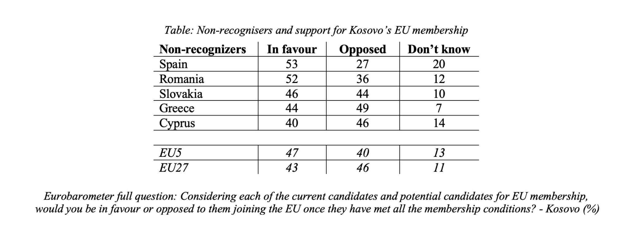 Në përgjithësi, mesatarja e pesë vendeve mosnjohëse të Kosovës tregon se 47 për qind e qytetarëve mbështesin anëtarësimin e Kosovës në BE, përballë 40 për qind që janë kundër, derisa në nivel të përgjithshëm, mbështetja për Kosovën arrin në 43 për qind.