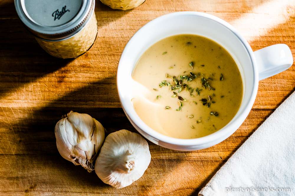 Në një tenxhere, mbi nxehtësi mesatare, vendosni dy lugë vaj ulliri dhe buteri. Zieni qepët për 10 minuta, më pas shtoni hudhrat e pjekura më herët. Përzieni mirë, shtoni supën e pulës, trumzën e prerë dhe barishtet e freskëta ose të thata.