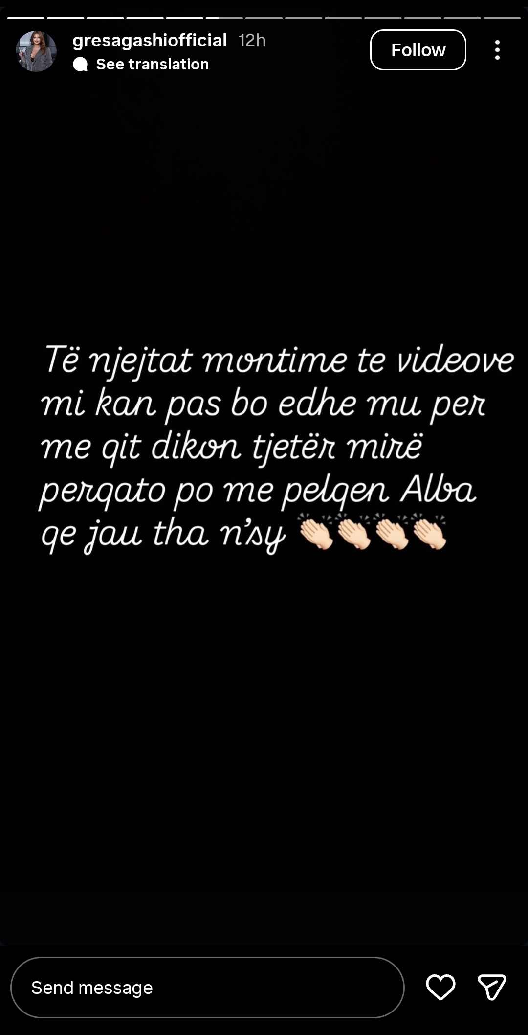 “Të njejtat montime të videove mi kan pas bo edhe mu per me qit dikon tjetër mirë, përqato po më pëlqen Alba që jau tha n’sy,” – ka shkruar Gresa, duke lënë të kuptohet se ajo ka përjetuar të njëjtën “padrejtësi” për të favorizuar banorë të tjerë.