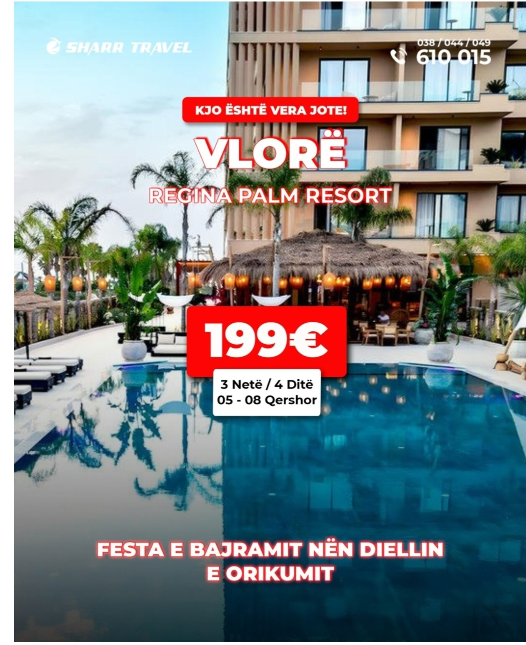 Me vetëm 199 euro ju mund t’i kalon 4 ditë e 3 netë në Regina Palm Resort në Orikum, Vlorë, nga 5 deri më 8 qershor 2025, me vetëm 199€ për person.