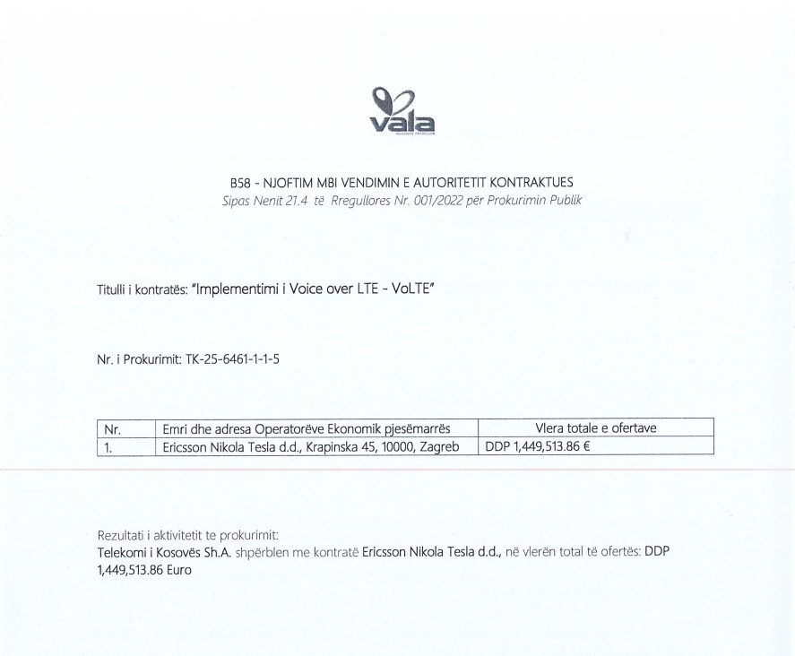 Kontrata ka të bëjë me implementimin e Voice over LTE – VoLTE, një projekt që lidhet me vazhdimin e modernizimit të rrjetit mobil të Telekomit, pas fazave të mëhershme të realizuara gjatë viteve 2022-2024. Arsyeja zyrtare: nevoja për shërbime më kualitative për konsumatorët.