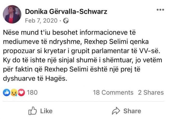 “Nëse mund t’ju besohet informacioneve të mediumeve të ndryshme, Rexhep Selimi qenka propozuar si kryetar i Grupit Parlamentar të VV-së. Ky do të ishte një sinjal shumë i shëmtuar, jo vetëm për faktin që Rexhep Selimi është një prej të dyshuarve të Hagës”, shkruante fillimisht Gërvalla më 7 shkurt, katër ditë pas formimit të Qeverisë Kurti I.