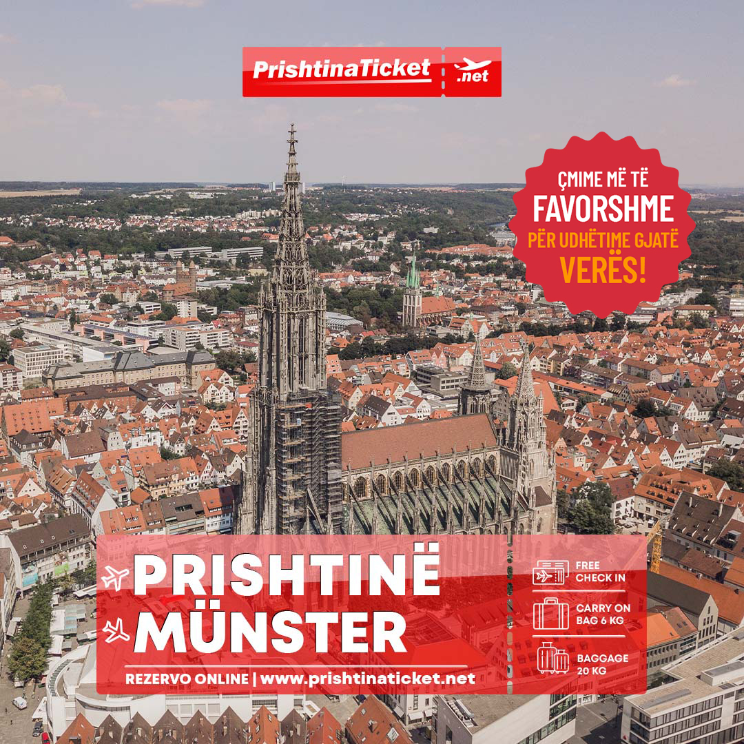Udhëtoni nga Münster drejt Prishtina dhe anasjelltas çdo të martë, të premte dhe të dielë me fluturimet direkte të PrishtinaTicket. Përfitoni nga çmimet e lira dhe udhëtimi bëhet i thjeshtë, i sigurt dhe komod.