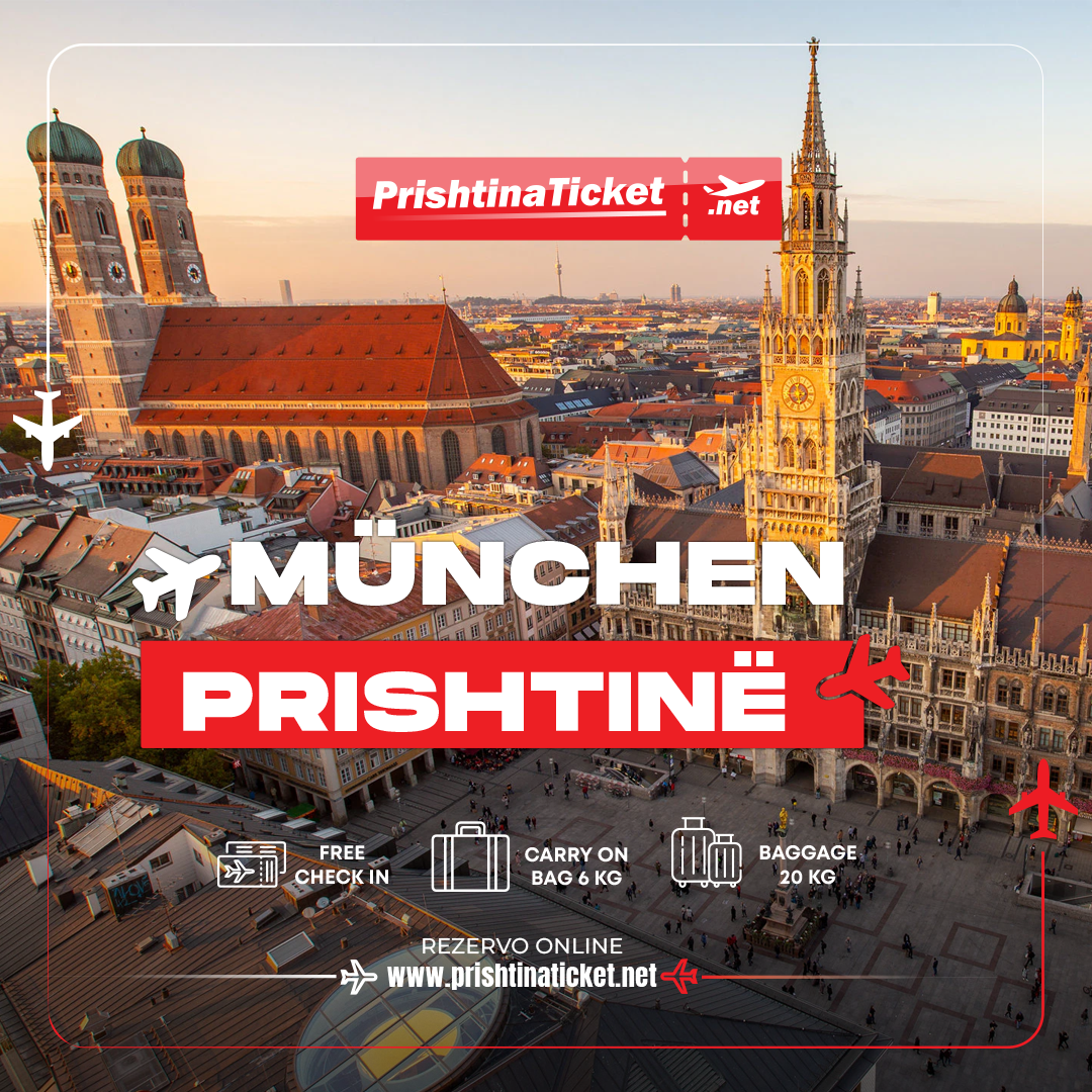 Udhëtoni nga München drejt Prishtinës çdo ditë të javës me PrishtinaTicket dhe përfitoni nga fluturimet direkte me çmime të përballueshme. Çdo fluturim ofron shërbim të plotë që përfshin check-in falas, zgjedhjen e vendit dhe bagazh deri në 20 kg, për një eksperiencë udhëtimi të rehatshme dhe pa stres.