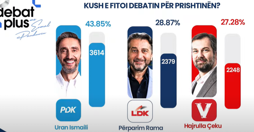 Debati i zhvilluar sonte në “Debat Plus” nga ora 20:30 deri në 23:45, ku përballeshin kandidatët për kryetar të Prishtinës – Urani Ismaili (PDK), Përparim Rama (LDK) dhe Hajrulla Çeku (VV) – ka nxjerrë një fitues sipas shikuesve.