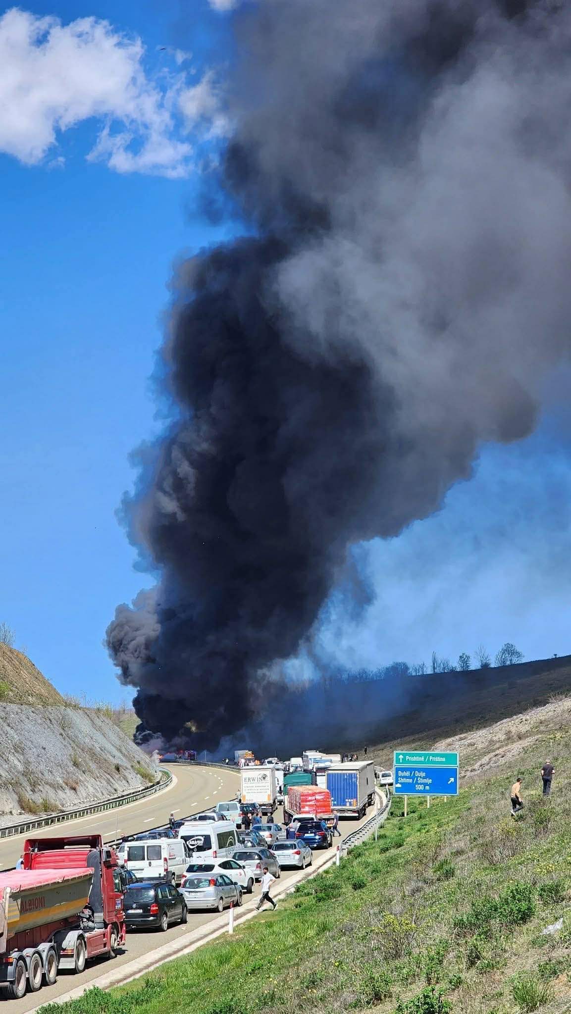 Sipas pamjeve nga vendi i ngjarjes, dyshohet se një kamion është përfshirë tërësisht nga flakët, çka ka bërë që qarkullimi i automjeteve të vështirësohet mjaft shumë.