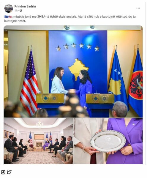 Miqësia jonë me ShBA-në është ekzistenciale. Ata të cilët nuk e kuptojnë këtë sot, e kuptojnë nesër”, ka shkruar Sadriu, teksa ka rishpërndarë një postim të një takimi të Presidendetës së Kosovës, Vjosa Osmani me Peace Corps-ët amerikanë.